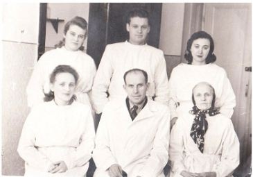 ( Зліва направо: вгорі – ст.лаб. Нікіфорова Л.М., ас. Тараховський М.Л., ас. Редько Г.Ф. внизу – ас. Невська Т.Л., зав. каф., проф. Закривидорога С.П., препаратор)